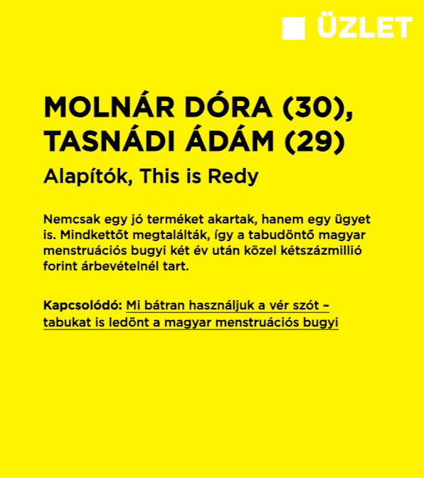 Meg akarták mutatni, hogy a menstruáció szupererő, a női testnek nem kell tökéletesnek lennie ahhoz, hogy vonzó legyen. A tabudöntögető menstruációs bugyi, a This is Redy alig másfél éves, de az alapítópáros, Molnár Dóra és Tasnádi Ádám lassan túl vannak a 20 ezredik eladott terméken is, árbevételük pedig meghaladja a 100 milliót. Koronavírus ide vagy oda.