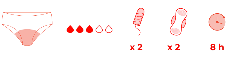 - ha valakinek extrán erős a vérzése (pl. óránként cserél betétet), ő ne önmagában használja a bugyit, mert akkor valószínűleg cserélnie kell majd, hanem plusz védelemként, tölcsér, tampon betét alá!